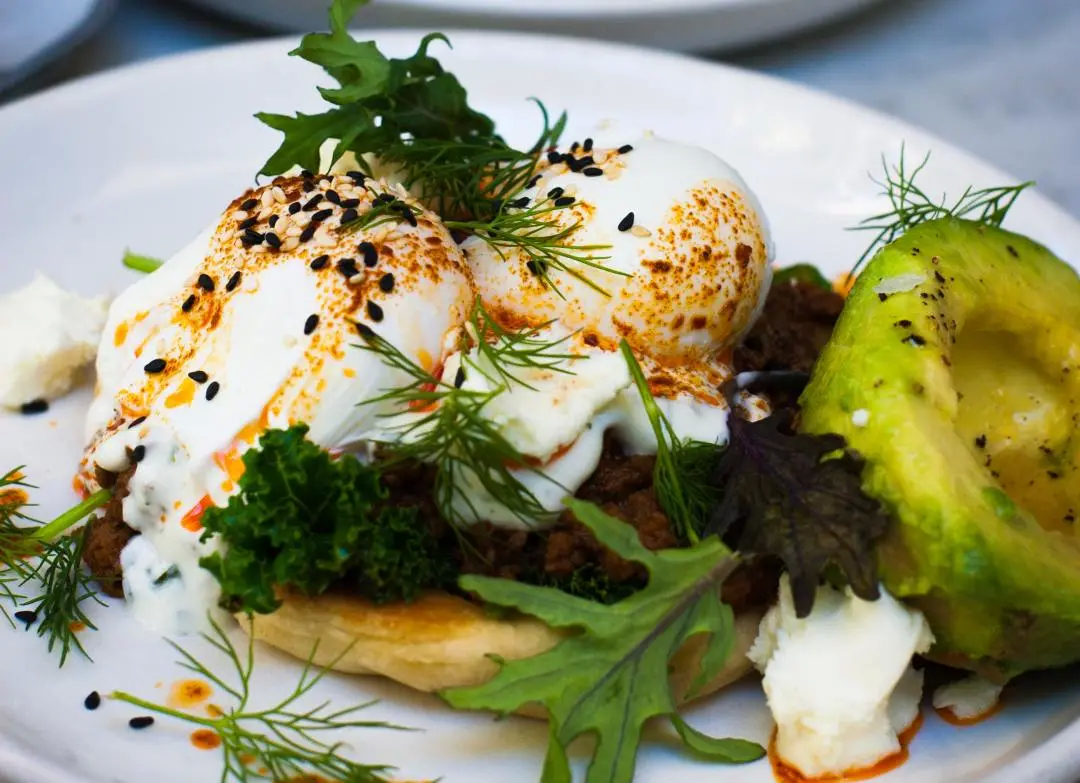 7、烤好的吐司放培根、菠菜、溏心蛋,淋荷蘭汁,撒黑胡椒,即可享用。