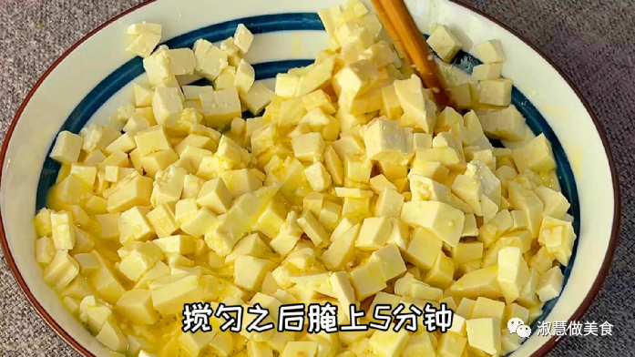 鍋中多倒一些食用油,油溫五成熱,將剪短的粉條,放入油鍋里炸一炸,哇,非常的漂亮,將粉條炸干就可以啦,倒入盆中,用搟面杖敲碎一點(diǎn)。最后敲成這個(gè)程度就可以啦,然后倒入白菜里,用筷子攪拌均勻,加入粉條可以吸收白菜里面多余的水分,防止白菜出水,并且白菜里加入粉條,吃起來會別有一番風(fēng)味,攪勻后先放一旁備用,接下來準(zhǔn)備一塊嫩豆腐先切成薄片,再切成粗條,最后切成小碎丁,切好后放入盤中。準(zhǔn)備一個(gè)小碗兒,在里面打入一個(gè)雞蛋,用筷子充分?jǐn)嚿ⅲ缓髮㈦u蛋液倒入豆腐里,在里面加入兩克食鹽,增加底味,用筷子攪拌均勻,使每一塊豆腐都均勻的裹上一層雞蛋液,像這樣就可以,攪勻后腌上五分鐘,這樣會更加入味。