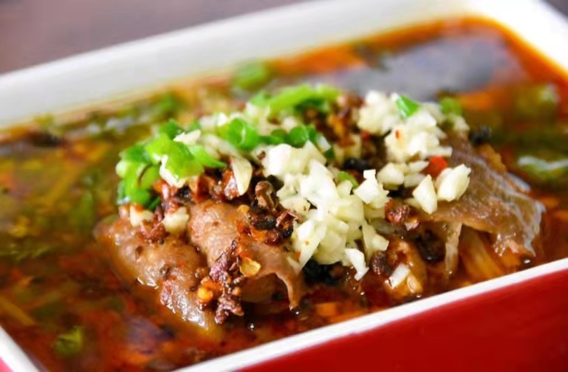 3煮開后倒入肥腸鴨血煮兩分鐘左右起鍋裝盤,鍋里再燒適量油,把干辣椒剩下的大蒜花椒一小撮撒在肥腸上面,油溫冒煙后分三次淋在肥腸上面,最后撒入適量蔥花,就可以開吃了