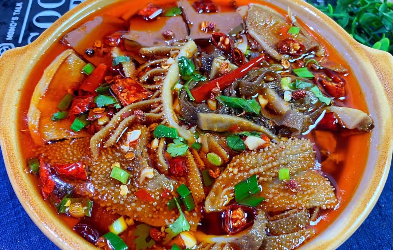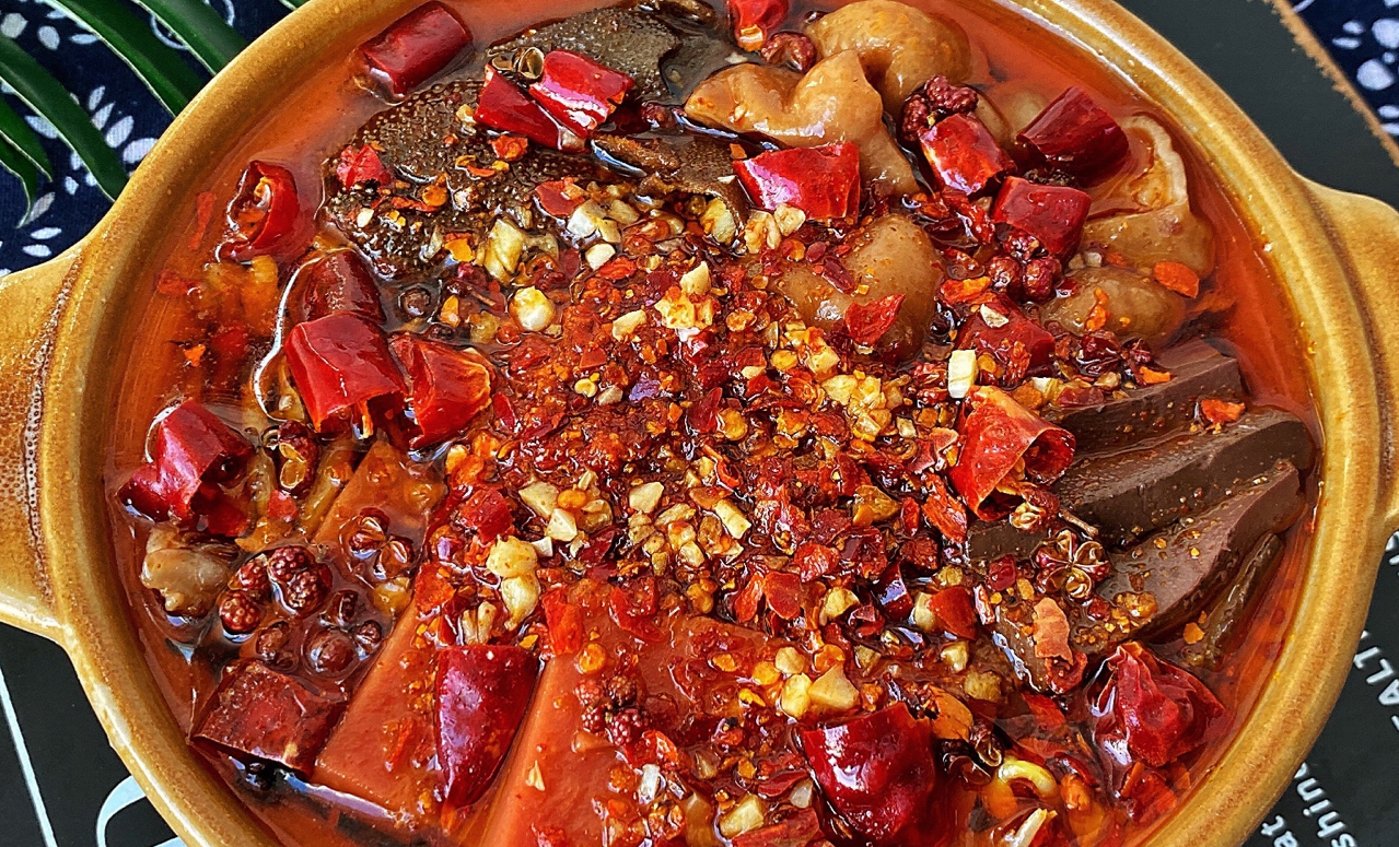 毛肚、鴨血、豆芽、蔥姜蒜、花椒粒、干紅辣椒、火鍋底料、豆瓣醬