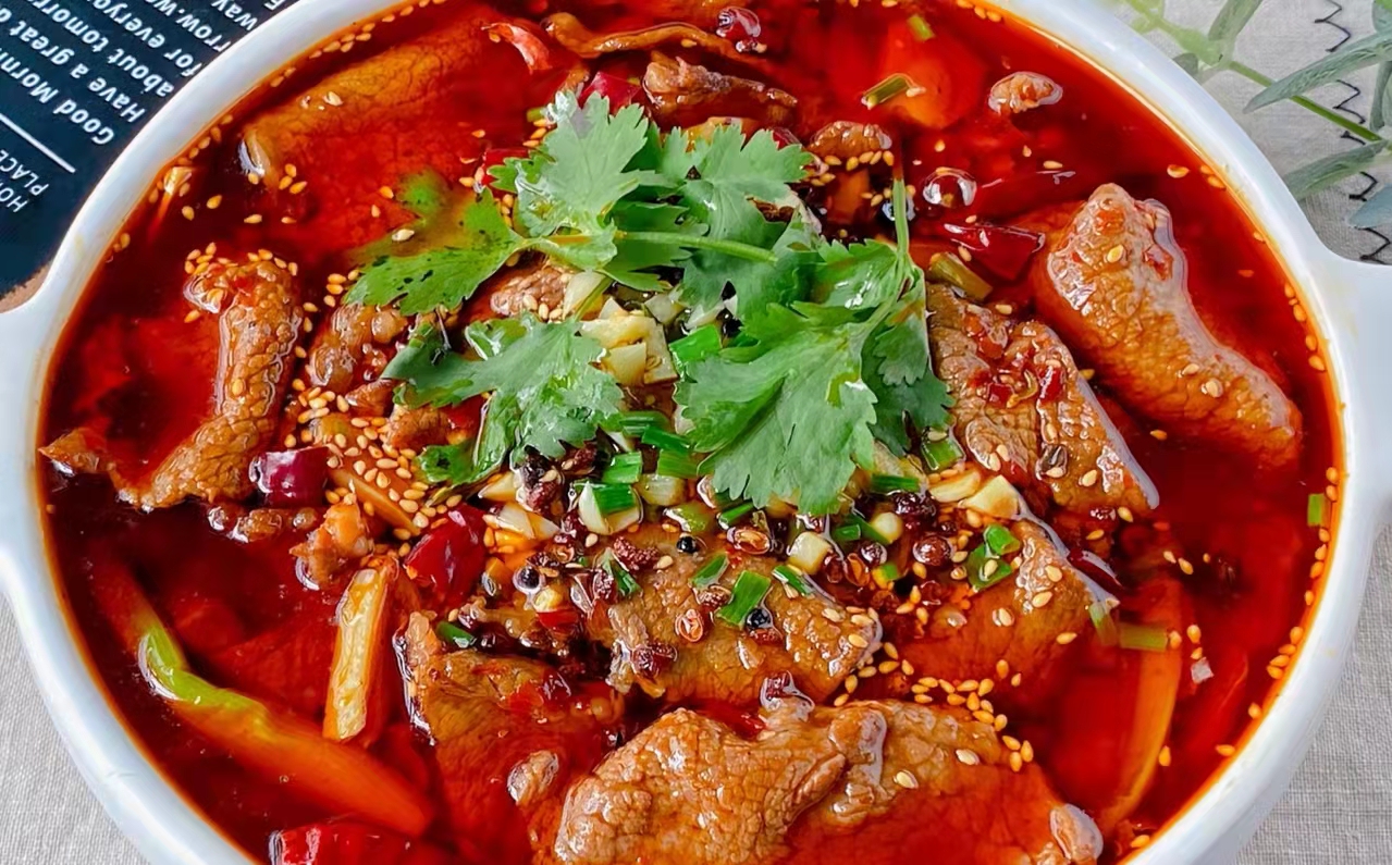 3鍋加熱倒油,放入蔥姜蒜炒香,放入火鍋底料炒出紅油,加入兩碗清水,水開了下牛肉片煮1-2分鐘,連湯一起倒入碗中
