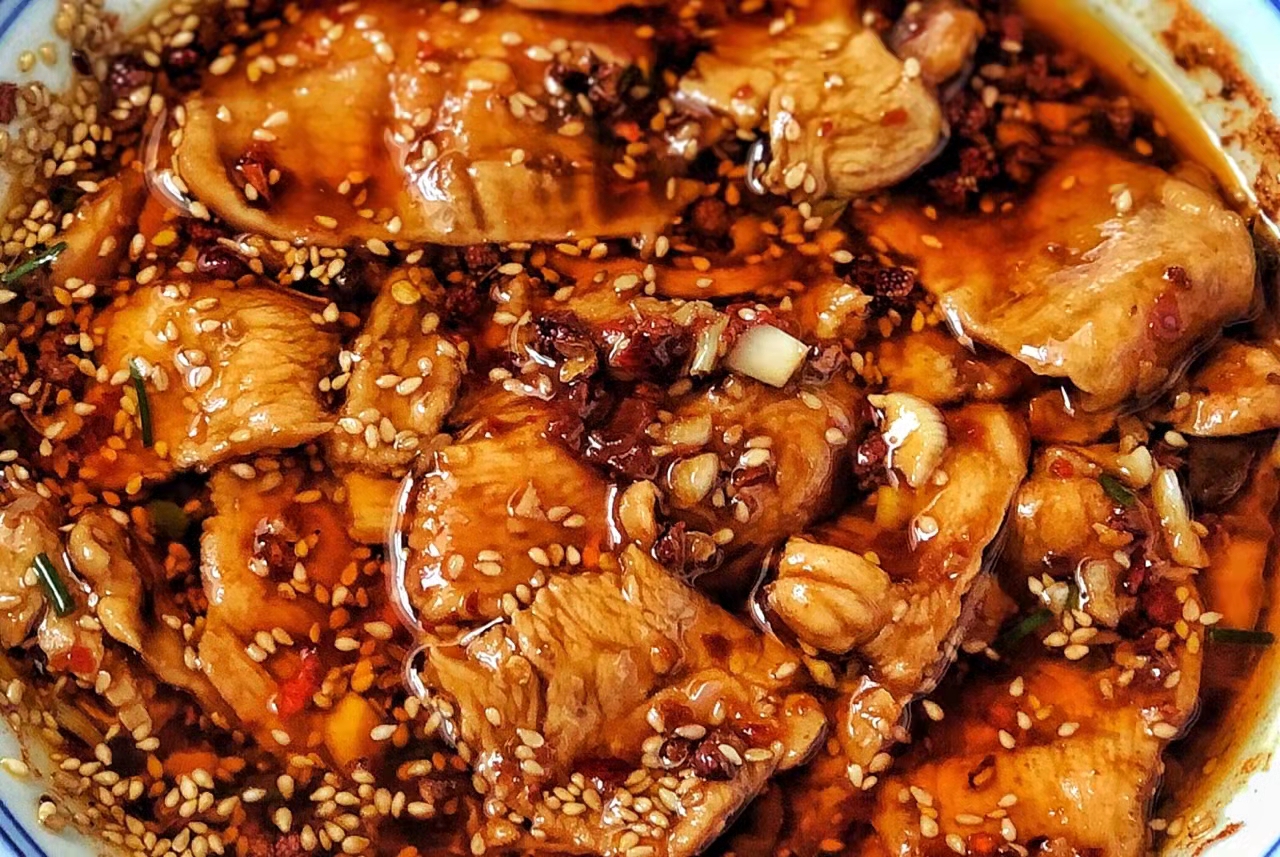 3接著一片一片的下入雞肉片煮至浮起,放入1勺生抽,1勺老抽,1勺蠔油,少許雞精,連湯帶雞肉片一起倒入碗中。放入蒜蓉,辣椒粉,麻椒,熟芝麻,潑入沸油,撒上蔥花即可。