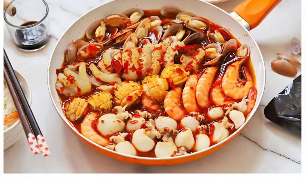 3、海鮮均勻擺放在鍋里,倒入火鍋湯底,再次煮開即可。