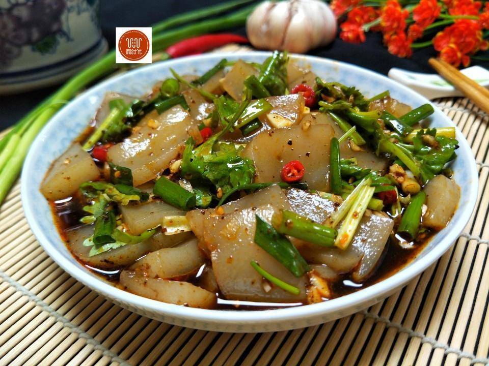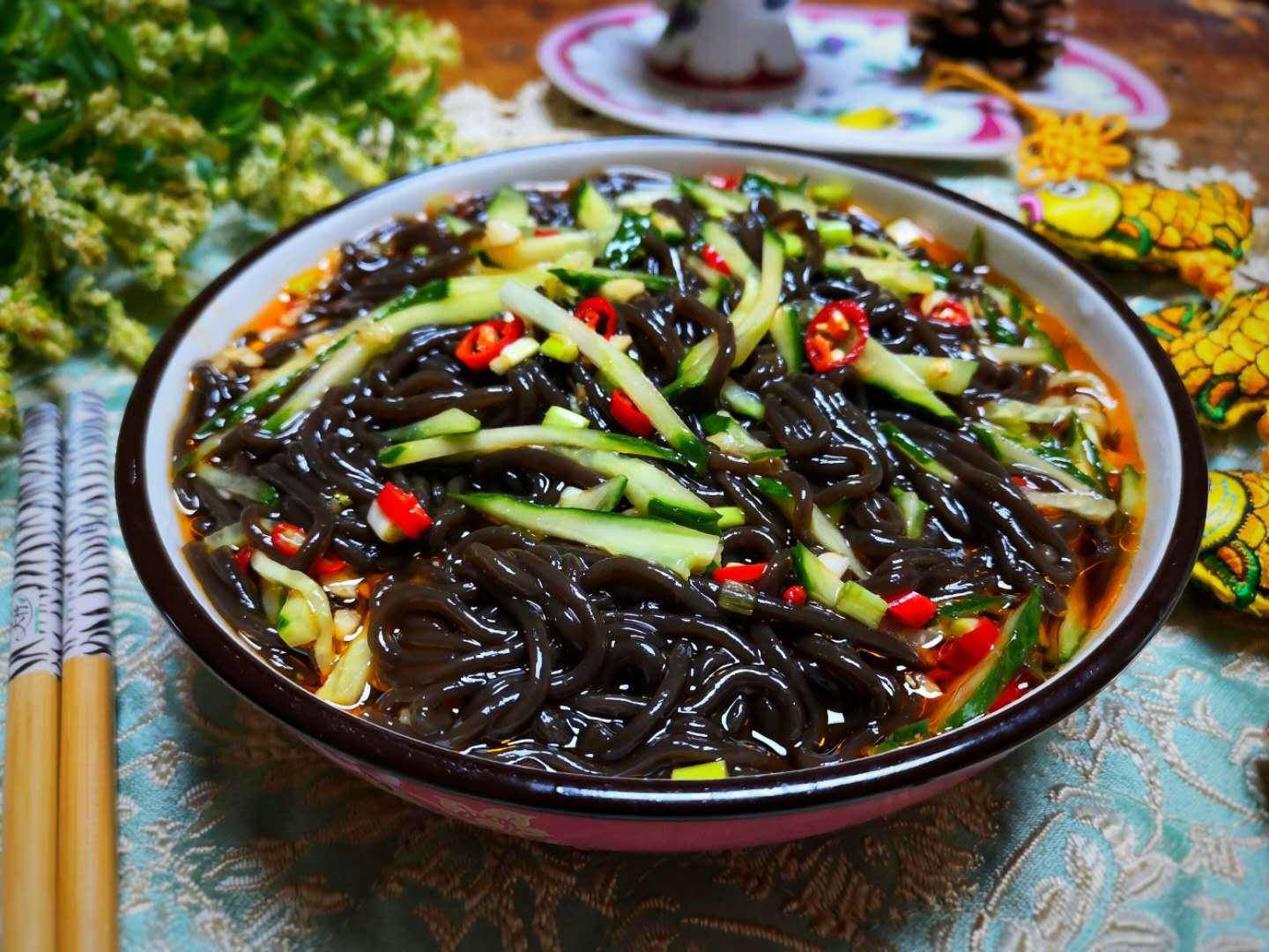 食材:蕨根粉1把、黃瓜半根、蔥段幾小根,大蒜1頭、小米椒3根、1勺生抽、2勺香醋、鹽少許、糖少許、涼拌紅油1勺。