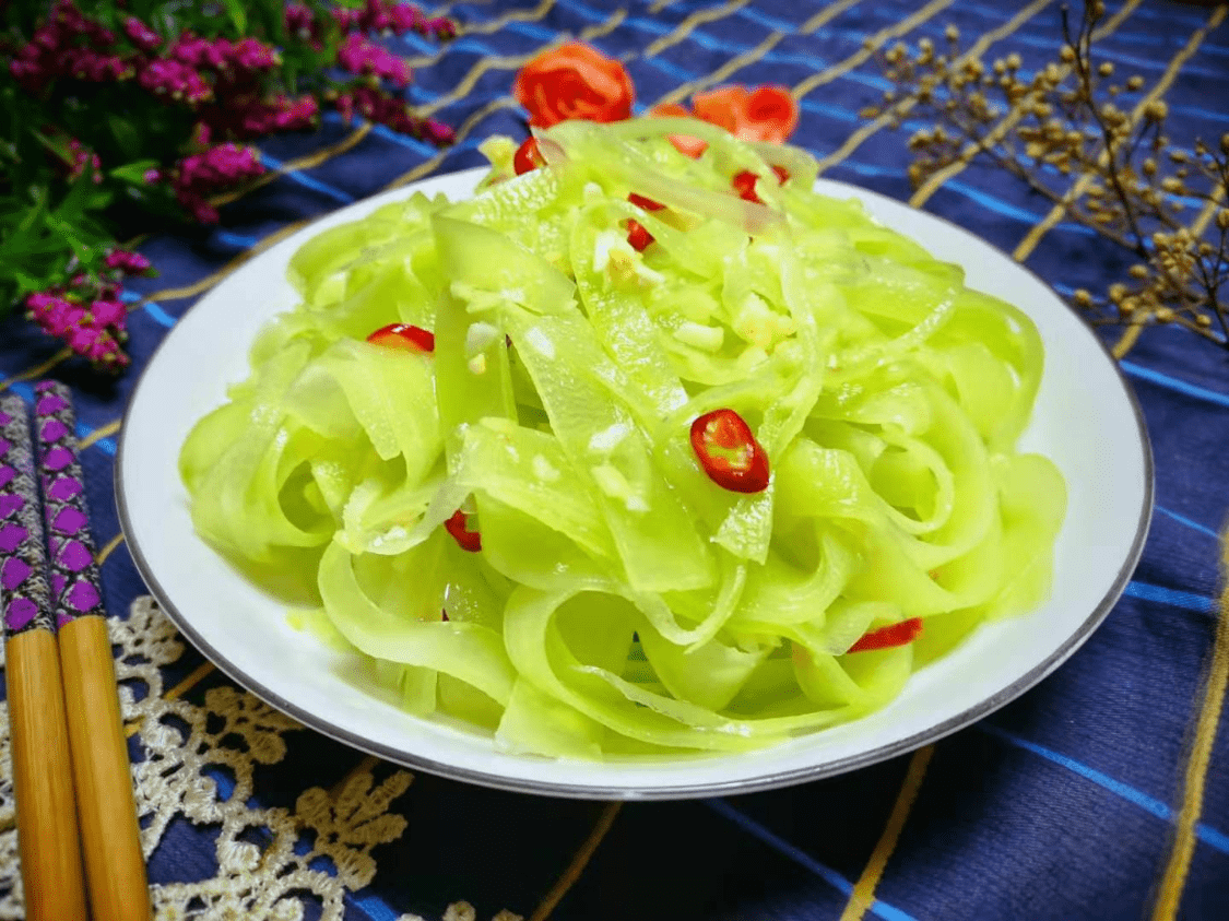食材:萵筍1根、蒜半頭、姜1塊、小米椒3根、半勺鹽、2小勺白醋、1勺花椒油、少許白糖。