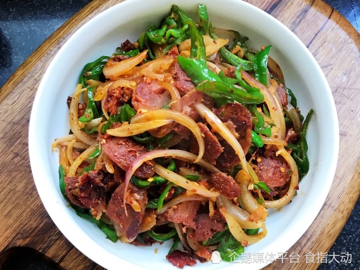 平底鍋入油燒熱倒入蒜爆香,放入臘腸翻炒。