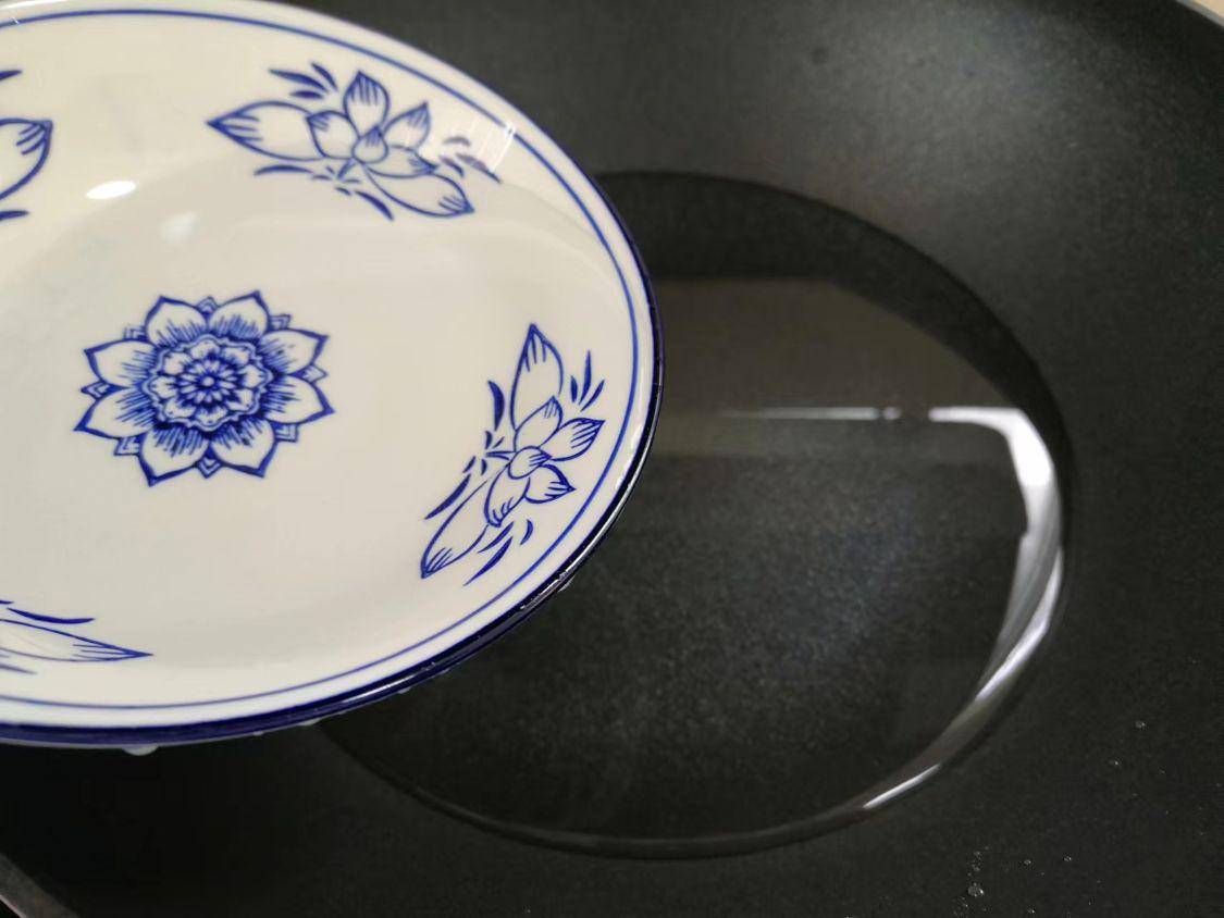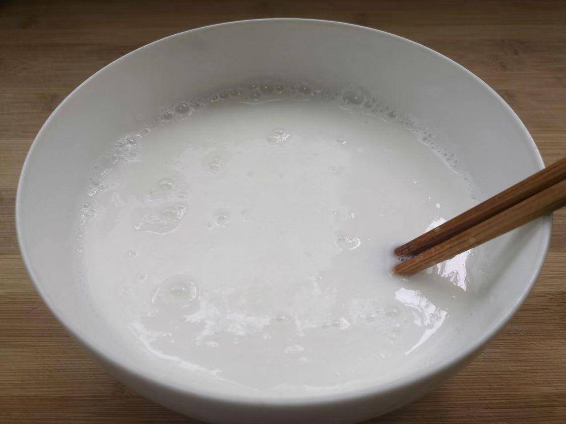 2、綠豆淀粉倒入盆中,再加入一碗清水,一定要用剛才裝綠豆淀粉的碗量清水,淀粉和水的比例是1比5,一碗淀粉用了5碗清水,用筷子輕輕攪拌至完全沒(méi)有粉粒,粉漿就做好了。