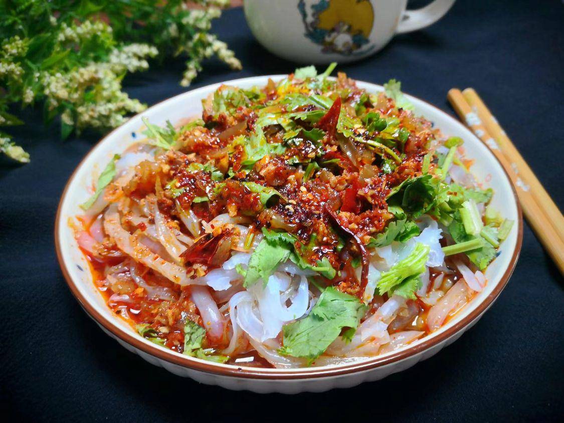 食材:綠豆淀粉1碗、清水5碗、鹽適量,配料:鹽、生抽、香醋、香油、香菜段、蒜末、姜末、芝麻、辣椒面。