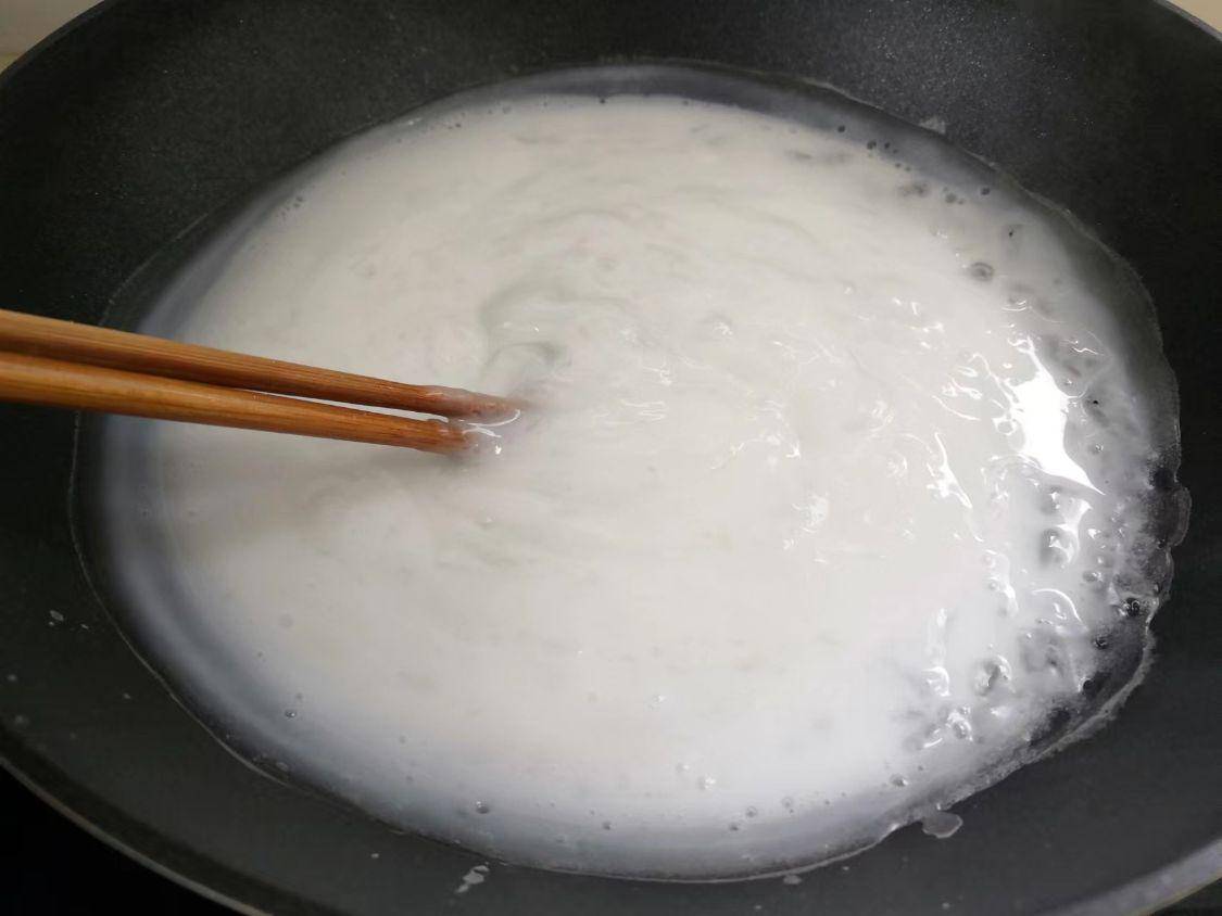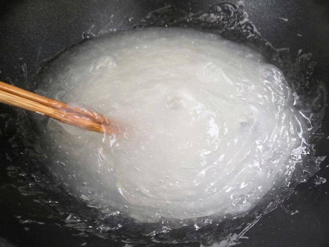 4、邊攪水邊把淀粉糊倒進(jìn)鍋里,一定要不停用筷子攪拌,使淀粉糊均勻受熱,以防糊鍋底。