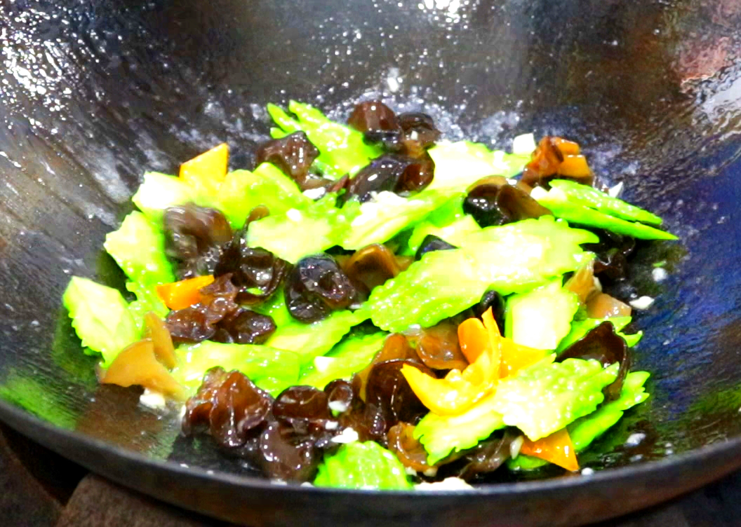3、另起鍋添入少許食用油,倒入蒜末爆香,再把苦瓜和木耳放進(jìn)去翻炒幾下,倒入少許清水,加入2克食鹽,白糖、雞粉各1克,快速翻炒至調(diào)料化開,再勾入少許水淀粉,簡單翻炒幾下,淋入少許明油,簡單翻勻,關(guān)火起鍋裝盤即可食用。
